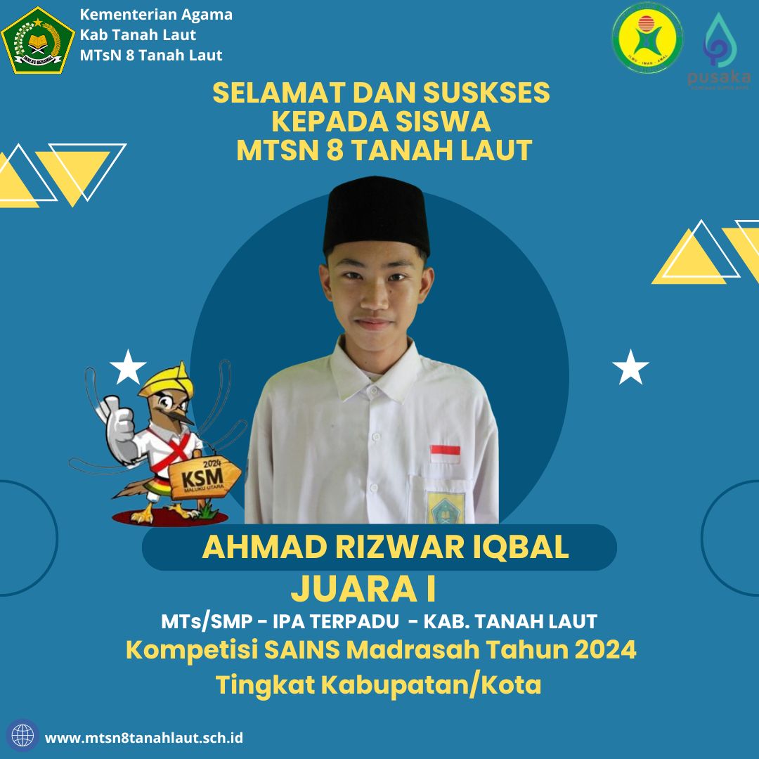 ![]() | Juara 1 KSM tingkat Kab AHMAD RIZWAR IQBAL Meraih juara 1 (pertama) pada KSM Tingkat kabupaten kota |